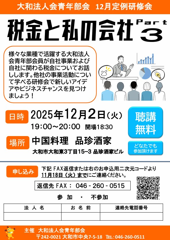 大和法人会青年部会員が自社事業および自社に関わる税金についてお話します。
