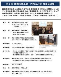 大和法人会と綾瀬市商工会では、会員交流会を開催します。本交流会は、両会の会員・非会員の皆様による異業種交流を通じて、人脈形成やビジネスマッチングの機会を創出することを目的としています。新たなビジネスチャンスにつながる […]