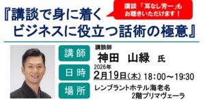 この度、事業研修委員会では下記のとおり経営セミナーを開催いたします。 本セミナーの講師には人気若手講談師の神田山緑 氏をお迎えし、「講談で身につく ビジネスに役立つ話術の極意」をテーマに、相手を惹 […]